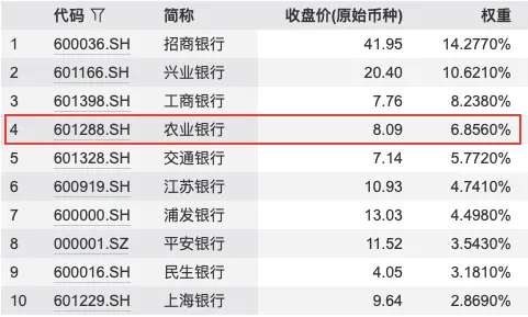农业银行位列中证银行指数前5大成分股,权重比约6.86% 图源:Wind
