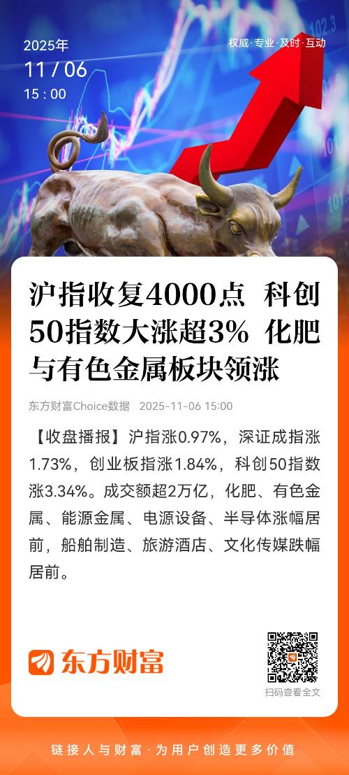 A股主要指数今日集体走强,沪指收复4000点大关。截止收盘,沪指涨0.97%,收报4007.76点;深证成指涨1.73%,收报13452.42点;创业板指涨1.84%,收报3224.62点;科创50指数涨3.34%,收报1436.86点。沪深两市成交额达到20552亿,较昨日放量1829亿。