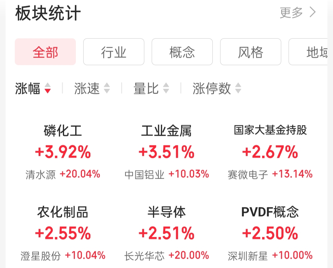 在板块方面,今日磷化工、工业金属、G家大基金持股、农化制品、半导体、PVDF概念等几个板块表现得比较积极,涨幅较多。这几日板块轮动依旧很快,板块持续差,看起来热闹,就是难以把握。今天指数涨的不错,但板块涨幅都不是很大,板块涨幅与九月时差距很大,市场仍有一些谨慎。