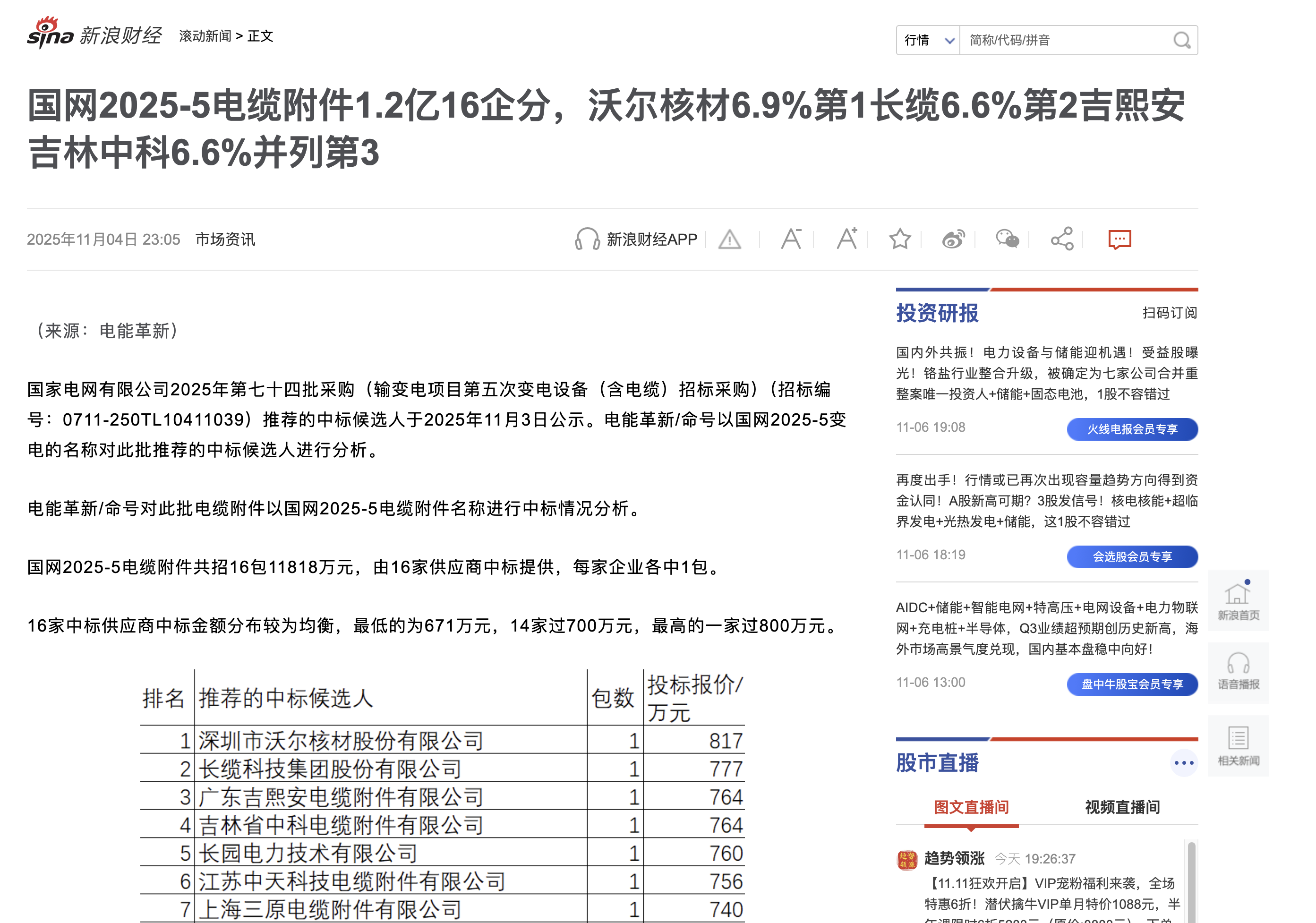 国网2025-5电缆附件1.2亿16企分,沃尔核材6.9%第1