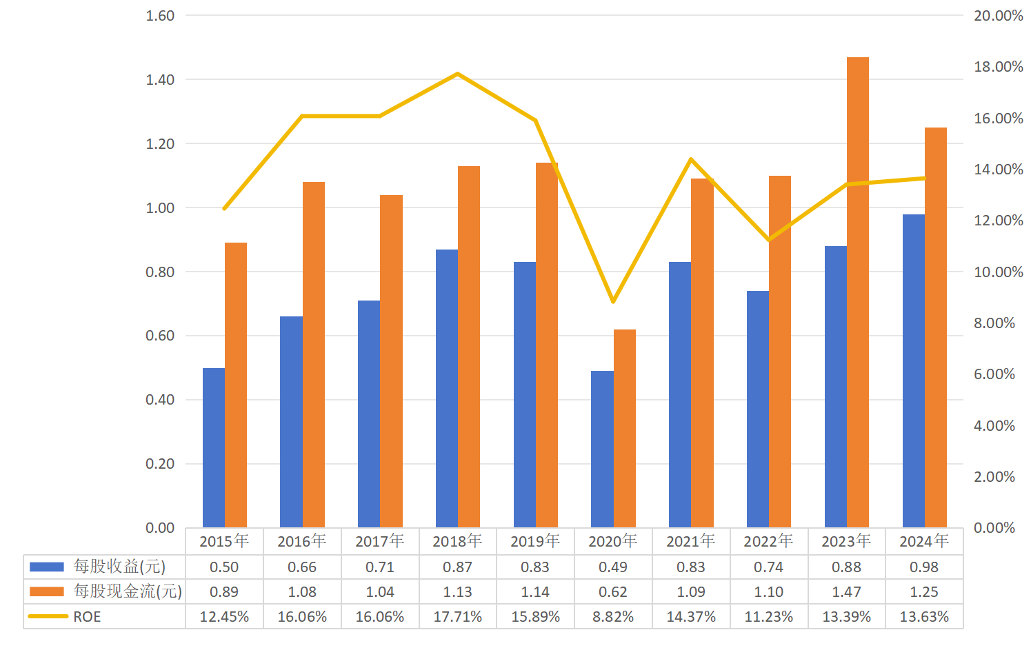 1、每股收益周期性比较弱,只在2020年特殊情况下出现了较大幅度的波动,而且成长性出乎意料的不错,过去十年每股收益接近翻倍;
