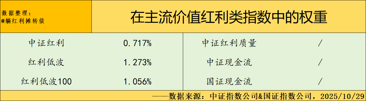 最后再补一张宁沪在主流价值红利指数中的权重数据汇总: