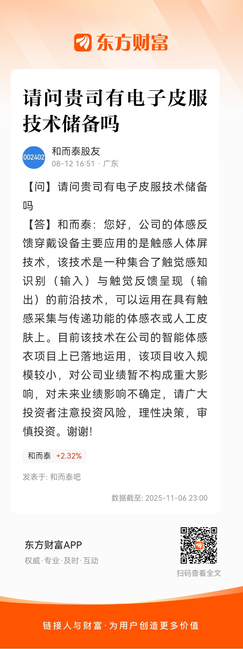 您好,公司的体感反馈穿戴设备主要应用的是触感人体屏技术,该技术是一种集合了触觉感知识别(输入)与触觉反馈呈现(输出)的前沿技术,可以运用在具有触感采集与传递功能的体感衣或人工皮肤上。目前该技术在公司的智能体感衣项目上已落地运用,该项目收入规模较小,对公司业绩暂不构成重大影响,对未来业绩影响不确定,请广大投资者注意投资风险,理性决策,审慎投资。谢谢!