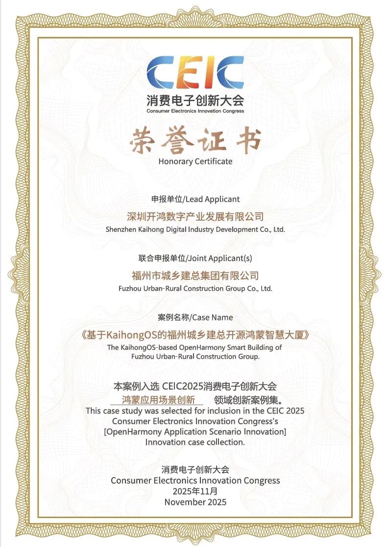 在智慧楼宇领域,现场展示了福州建总开源鸿蒙大厦案例。基于开鸿安全数字底座,智慧楼宇就如同“智能手机”,实现楼宇内异构设备跨端互联、数据统一调度及服务高效协同。值得一提的是,这一标杆性案例已被本次大会纳入“鸿蒙应用场景创新”领域创新案例集,用于研究或推广参考,为建筑行业数字化转型提供了成功范本。