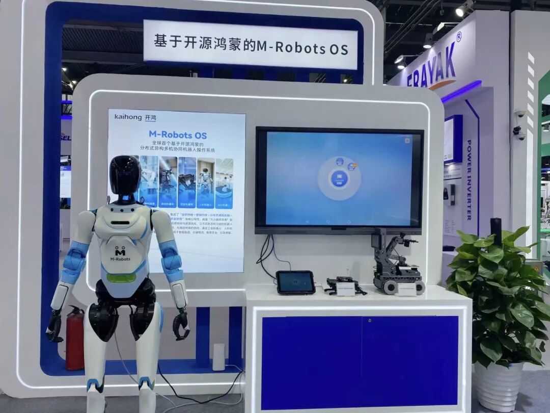 展区集中展示了基于“M-Robots OS”的多形态机器人协同作业能力。开鸿“驭”系列四足机器狗、开鸿“驭”系列移动机器人,以及数字华夏的“夏起”机器人,可以与平板、大屏等终端快速组成超级终端。观众不仅可指挥多台机器人完成协同演示,还能通过平板实时调用机器人摄像头画面、精准控制动作,亲身体验“千里眼”与“灵活手”的跨设备交互能力。同时,开鸿“驭”系列四足机器狗、开鸿“驭”系列移动机器人已具备AI手势识别能力,能够通过摄像头实时识别并响应观众手势,“夏起”机器人支持AI语音对话,进一步丰富了人机交互的维度与沉浸感,呈现了“M-Robots OS”在智能机器人领域的系统化能力。
