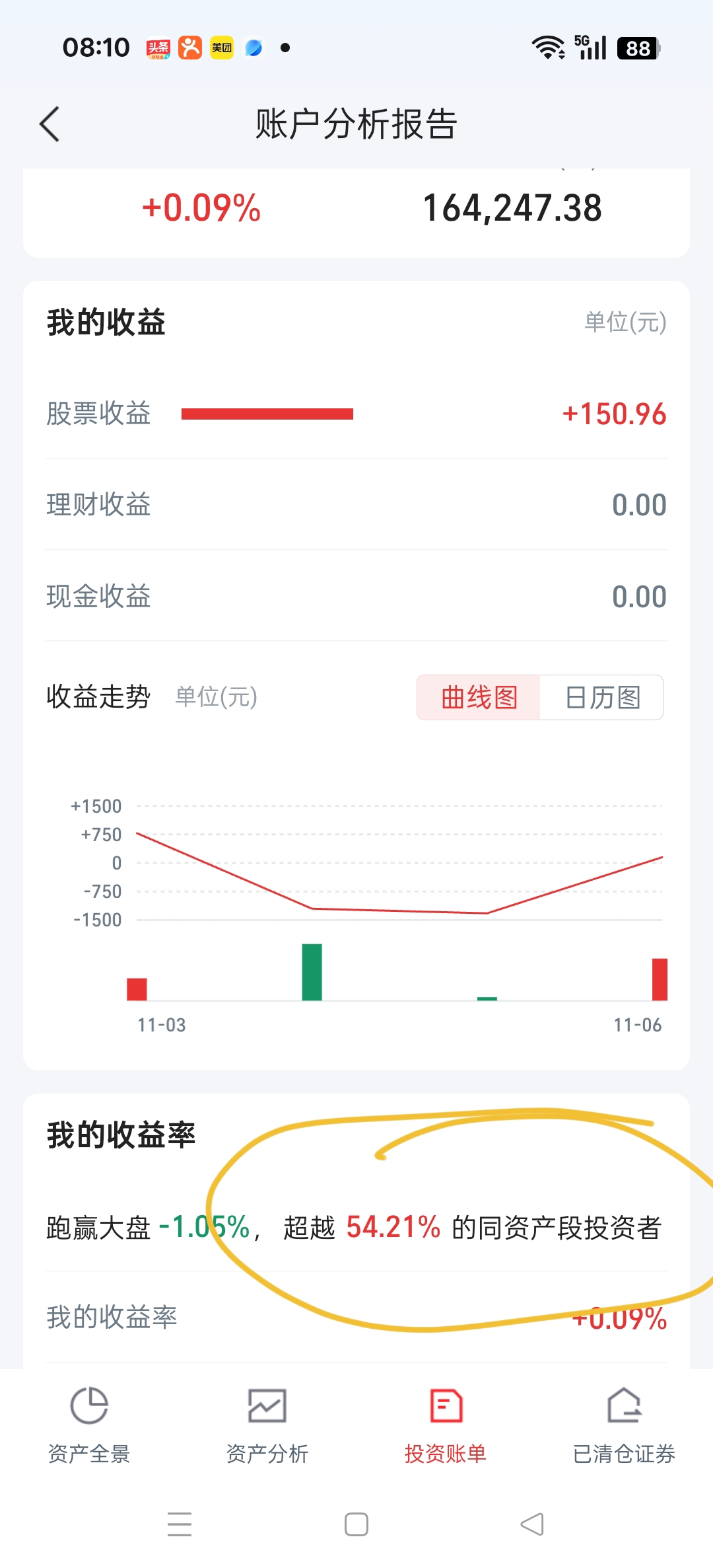 11月份赚了150块钱,居然战胜了54%的投资者,说明赚钱是很艰难的,大部分人都是亏损。