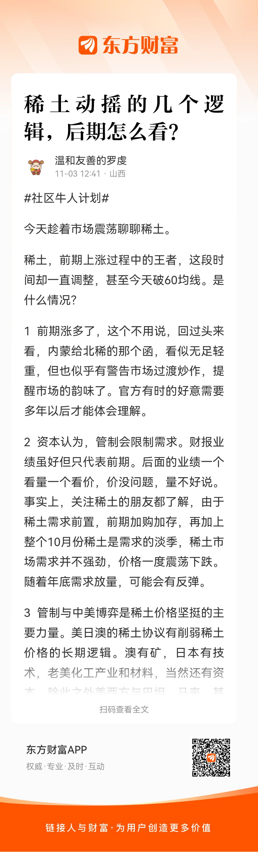 2 资本认为,管制会限制需求。财报业绩虽好但只代表前期。后面的业绩一个看量一个看价,价没问题,量不好说。事实上,关注稀土的朋友都了解,由于稀土需求前置,前期加购加存,再加上整个10月份稀土是需求的淡季,稀土市场需求并不强劲,价格一度震荡下跌。随着年底需求放量,可能会有反弹。