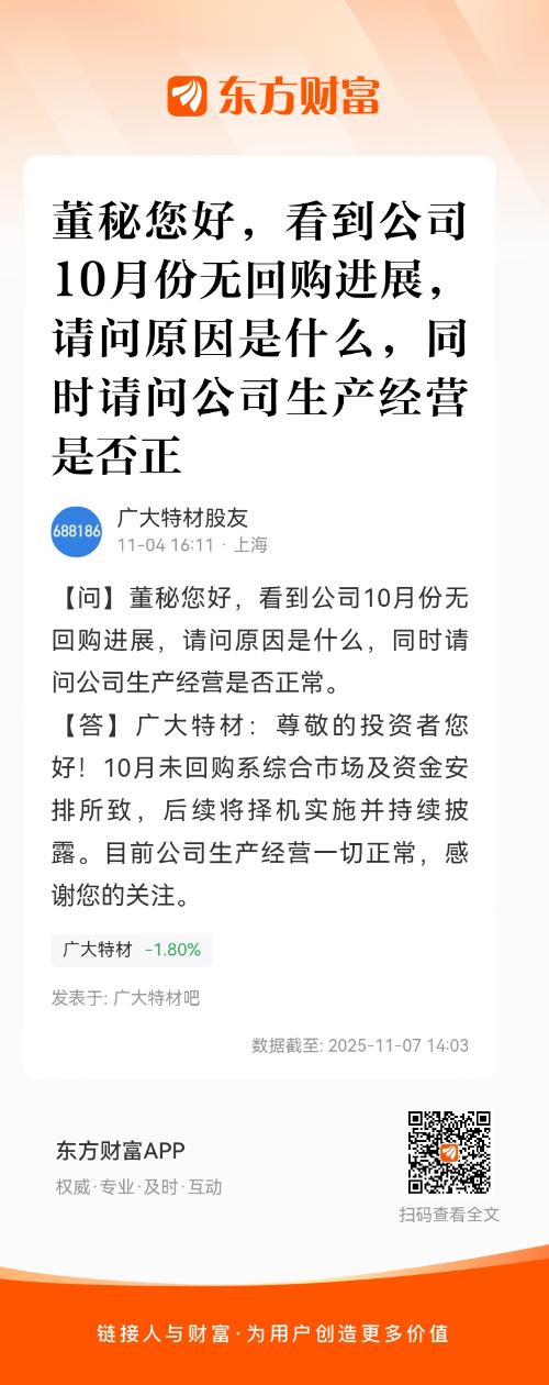 尊敬的投资者您好!10月未回购系综合市场及资金安排所致,后续将择机实施并持续披露。目前公司生产经营一切正常,感谢您的关注。