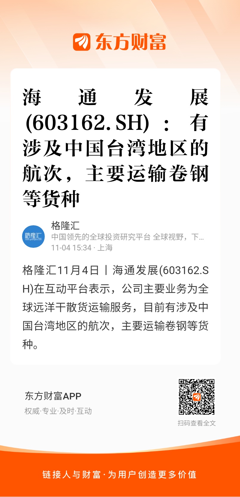 格隆汇11月4日丨海通发展(603162.SH)在互动平台表示,公司主要业务为全球远洋干散货运输服务,目前有涉及中国台湾地区的航次,主要运输卷钢等货种。