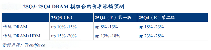 市场预测2025年Q4存储涨价幅度或超预期。TrendForce预计DRAM价格季增13%-18%,部分产品涨幅达30%,NAND 第四季度合约价增长5%-10%,并且很有可能再度上修。群智咨询分析,存储价格涨势将延续至2026年上半年,原厂库存仅约2周,对价格形成持续支撑。在AI与国产化双主线下,存储产业链业绩兑现空间显著:江波龙第三季度净利润暴涨1994%,兆易创新DDR5产品良率突破85%,长电科技HBM封装良率达98.5%。