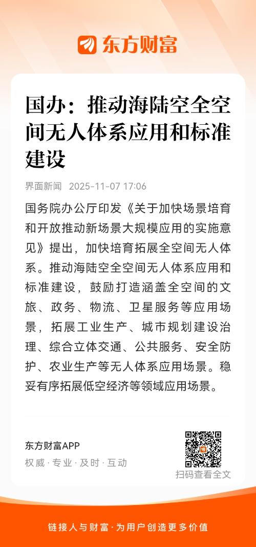 国务院办公厅印发《关于加快场景培育和开放推动新场景大规模应用的实施意见》提出,加快培育拓展全空间无人体系。推动海陆空全空间无人体系应用和标准建设,鼓励打造涵盖全空间的文旅、政务、物流、卫星服务等应用场景,拓展工业生产、城市规划建设治理、综合立体交通、公共服务、安全防护、农业生产等无人体系应用场景。稳妥有序拓展低空经济等领域应用场景。