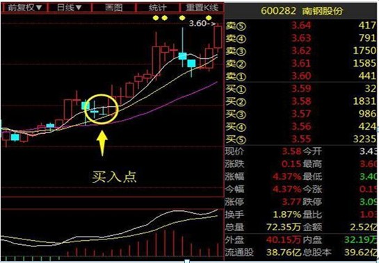 3,买入点:股价若有效跌破5线,这时注定会继续跌向10日线或20日线。如果在10或者20日线处企稳、股价再次启动,这时是介入的最好时机。