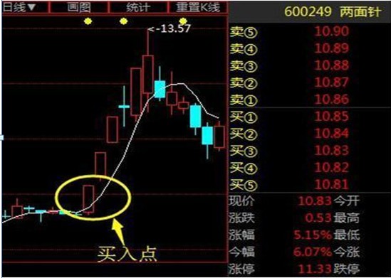 4、突破点:在股价上涨过程中向上突破5日均时的第一根阳K线。