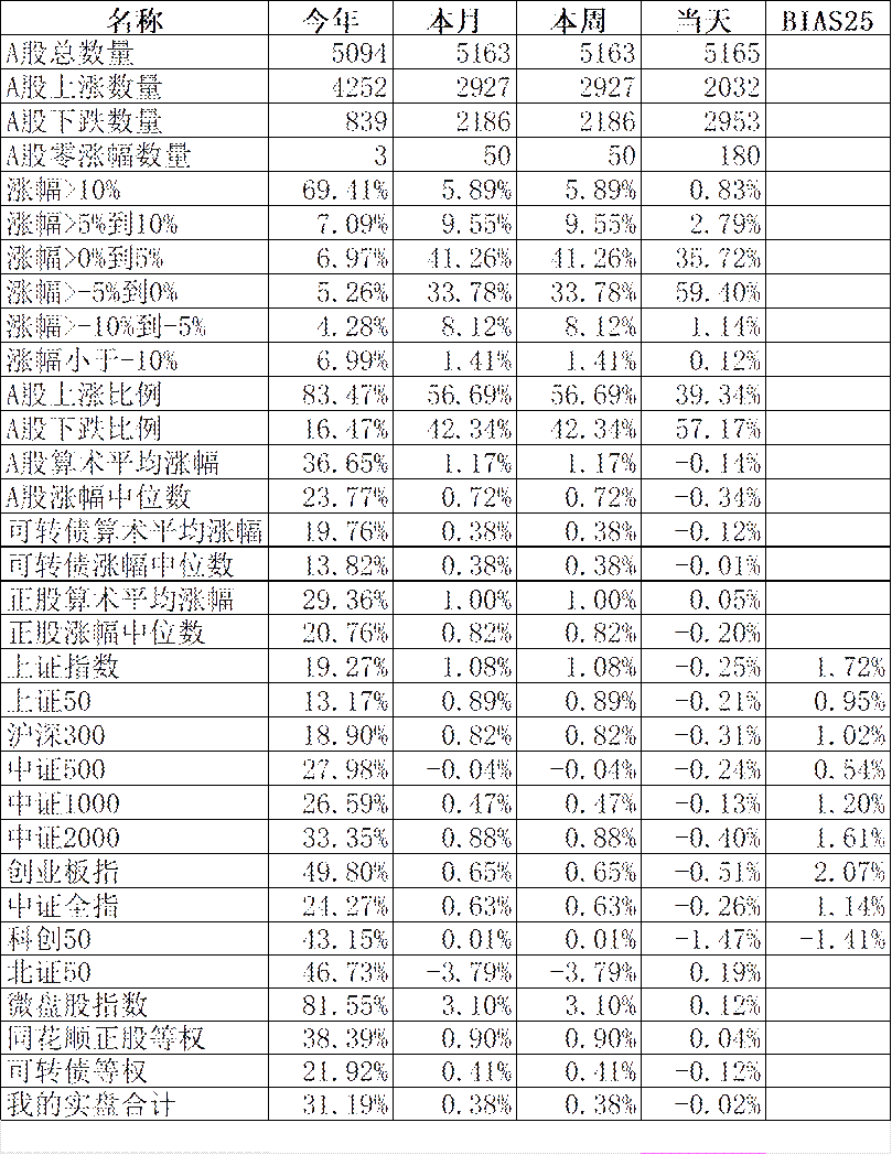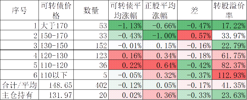 402只可转债平均下跌0.12,对应正股平均上涨0.05%。我的主仓20只可转债平均上涨0.02%,对应正股平均上涨0.36%。