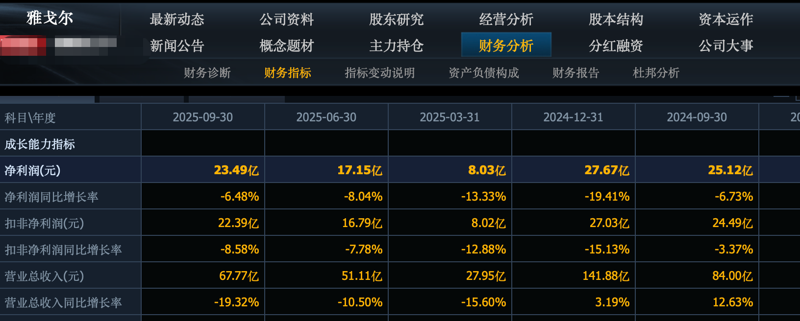 雅戈尔今年前三季度收入下滑19%到68亿元,净利润下滑6.5%到23亿元,收入利润也开始上下滑了。