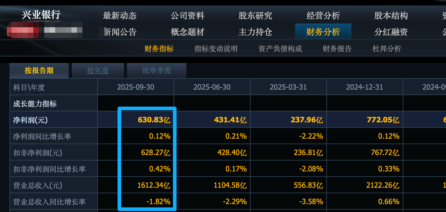 兴业银行今年前三季度收入下滑1.8%到1612亿元,净利润增长0.12%到631亿元。