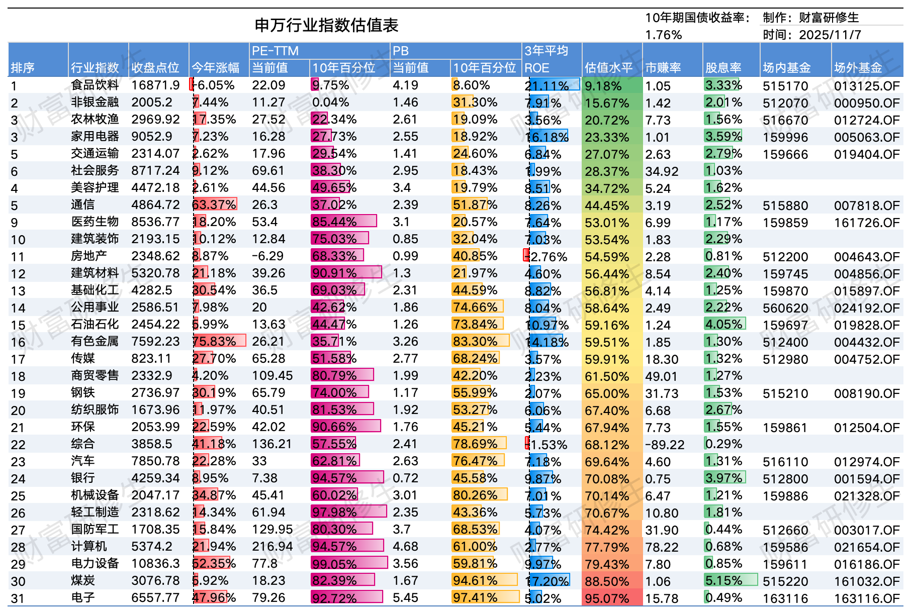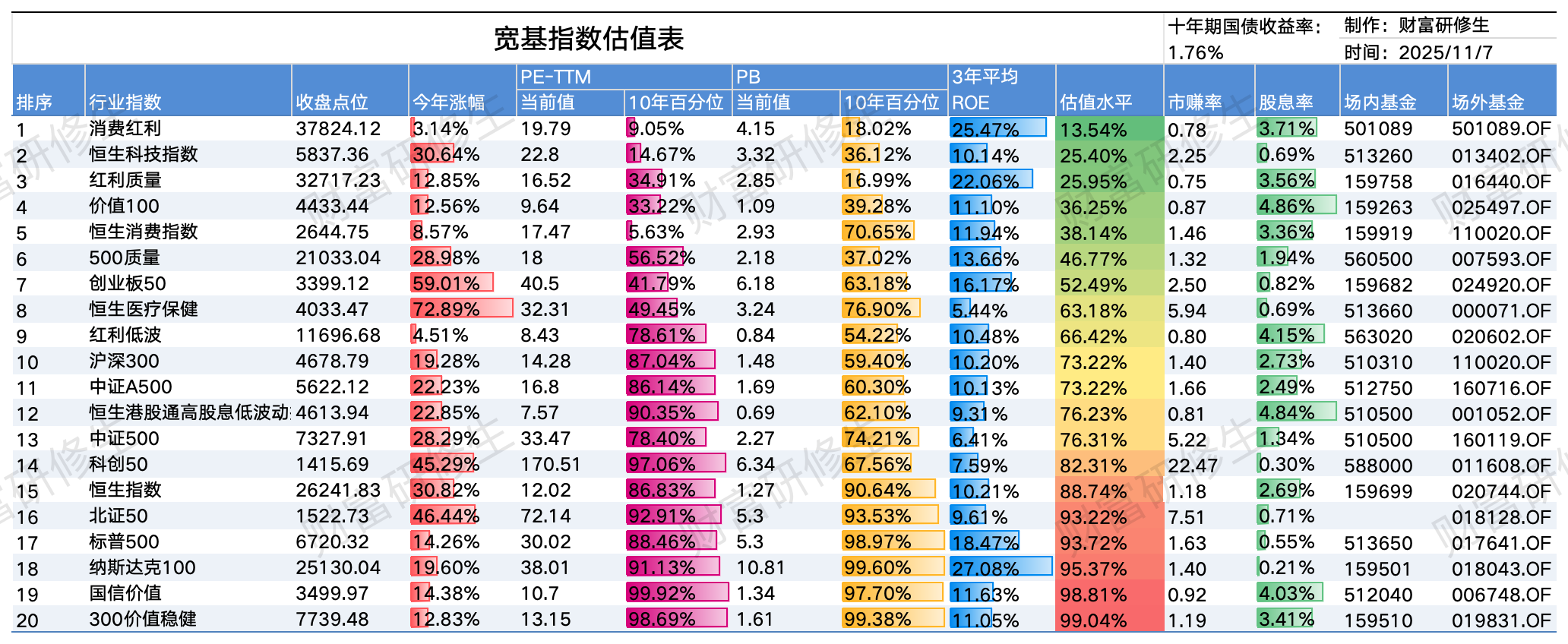 指数估值表(2025/11/7)宽基指数和行业指数估值表来了