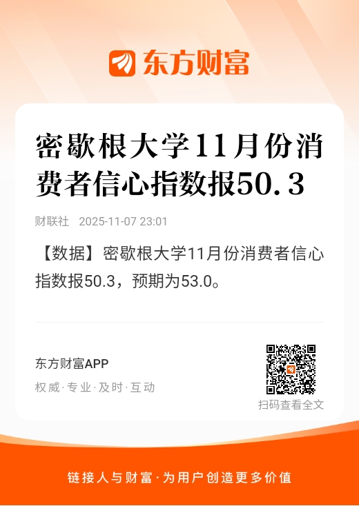 密歇根大学11月份消费者信心指数报50.3,预期为53.0。