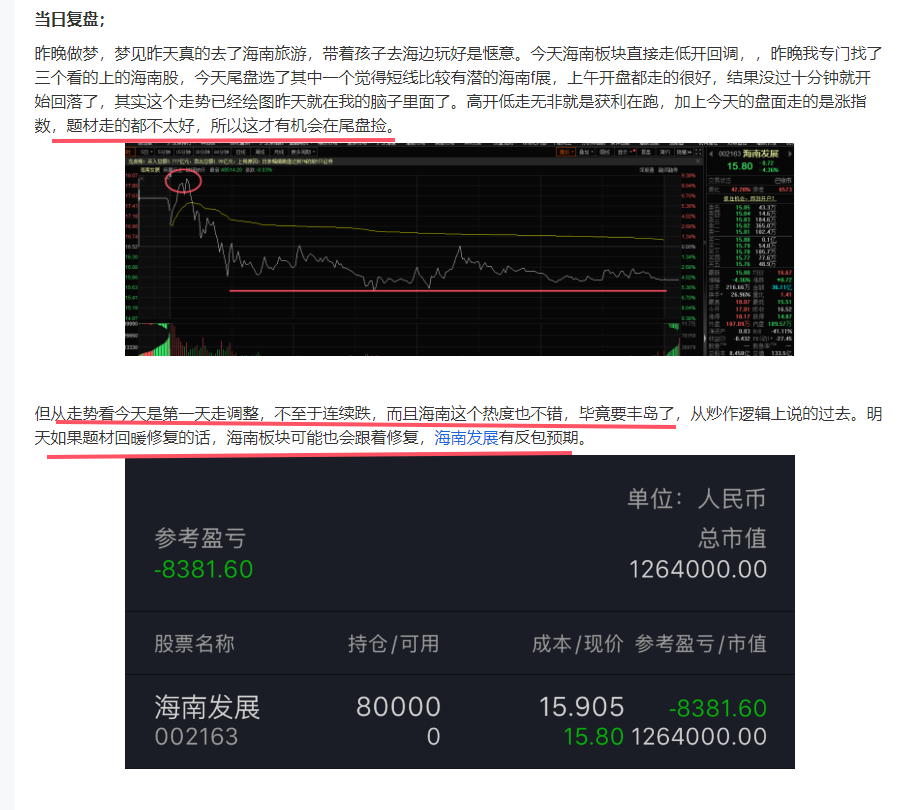 比如像昨天我收盘的时候是不是分享了海南板块我今天看好,结果早上集合竞价就走强了,昨天尾盘我收了$海南发展(SZ002163)$,今天还拿着呢。虽然早上涨停了但是我没有出,因为我知道下周还有,如果呢硬要问我为什么,我只能说我就是到了那个感觉。我感觉他会涨,我感觉他没有结束,我感觉。。就是我感觉。