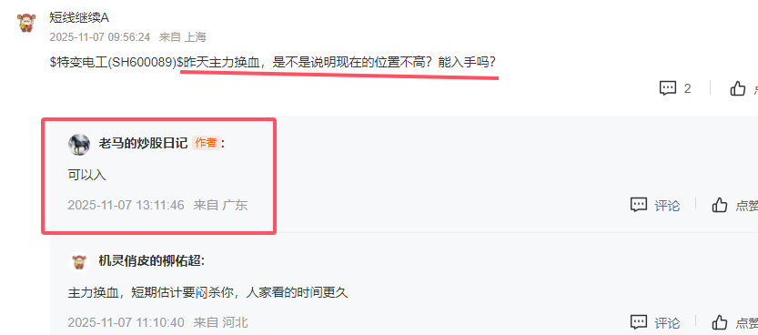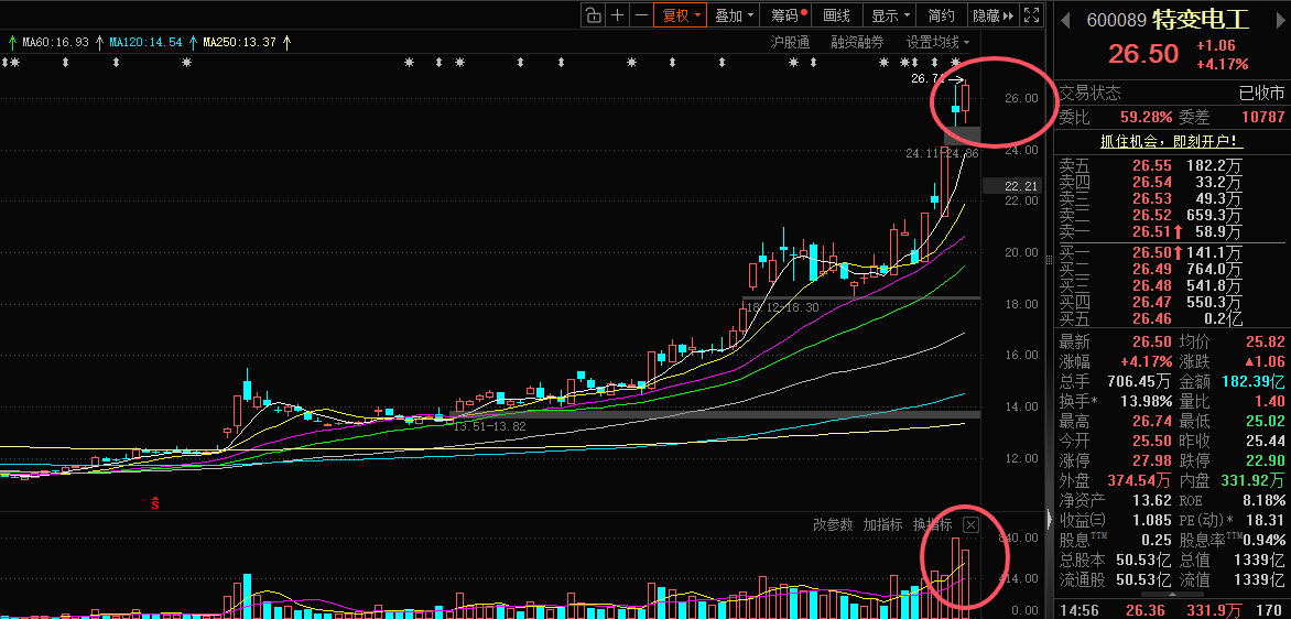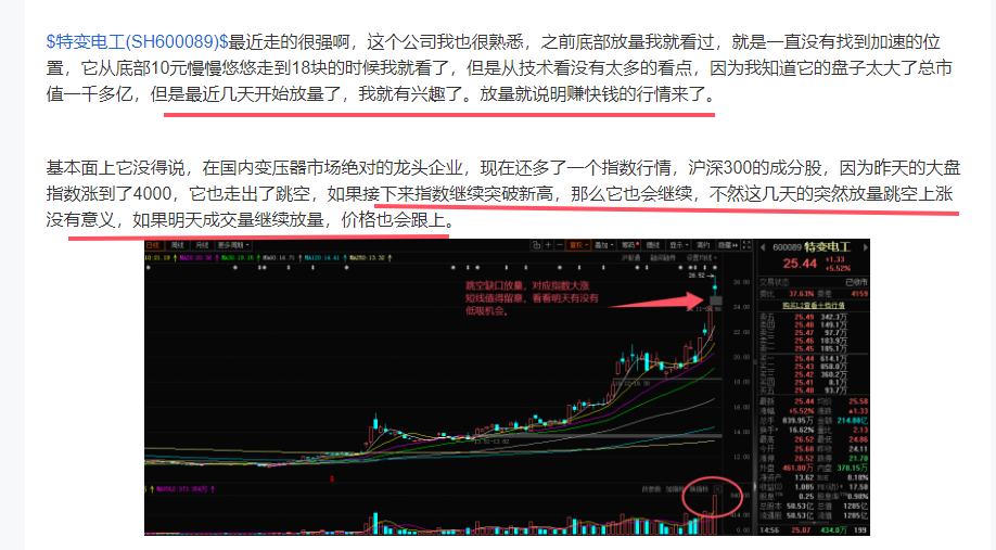 还有一个特变电工也是昨晚说的嘛,看今天这个走势也不错啊,虽然昨天评论区也有朋友说昨天成交百亿,今天能不能动,其实你说的都是我提前看过了,如果没有把握我不会拿出来说的,昨天200亿成交走出历史大量,而且还有跳空缺口,足以说明股性活跃,筹码交换多了,短期值得研究嘛。今天特变电工收盘还涨了四个多点。而且评论区我也回复了可以搞。今天搞了的这个朋友等会来个留言回复一下。