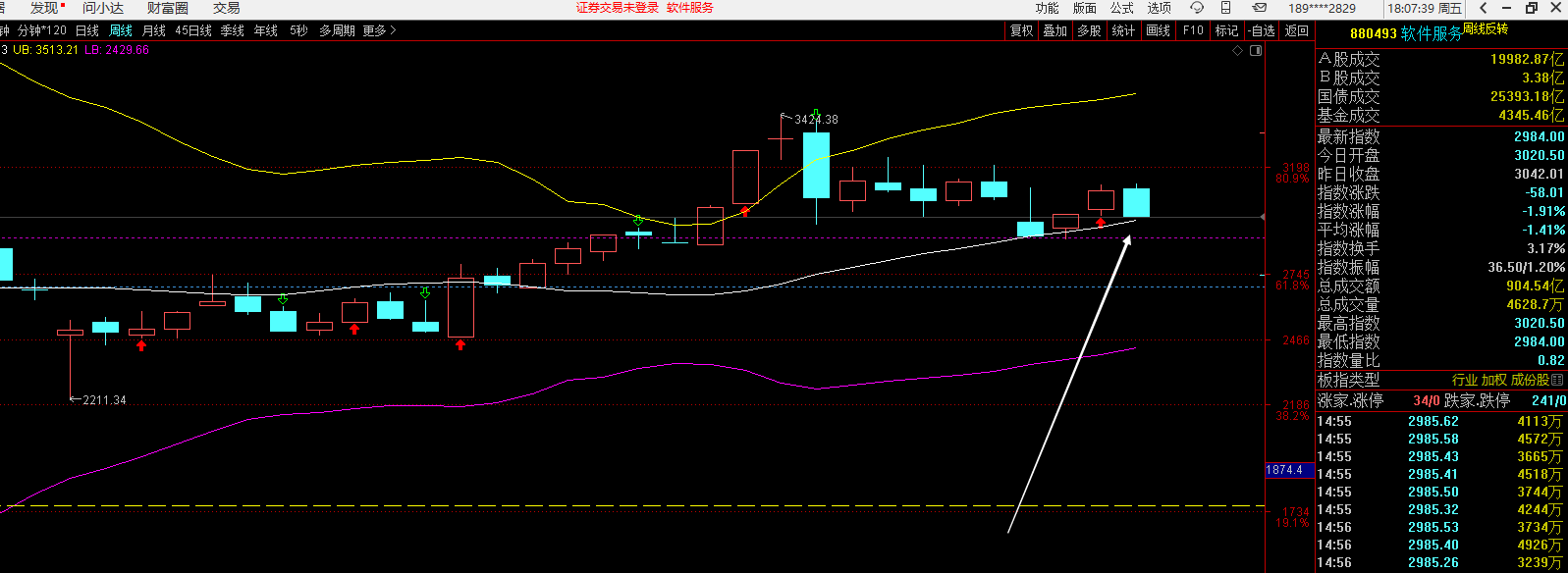 软件服务指数今天回调已经差不多了,星期二我在直播间和文档里面我就给大家讲了,软件服务指数这个地方大概会有三天左右的回调,今天已经回调了第4天,但是今天收盘是在布林线的中轨下方,这个有点不太好,但是通过周k线去看软件服务指数。今天的最低点刚好就是周线的布林线中轨,日线里面刚好是89天线的支撑位,我们在关注的有三个周线和月线同时共振的个股,这4天的回调根本就没有掉下去,这几天软件回调,他们回调的幅度2%都不到,这叫回调吗?我认为这三个票当中一定会有1~2个会像中能电气那样的走势