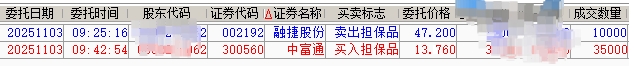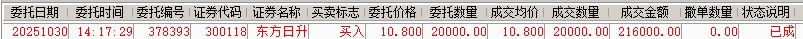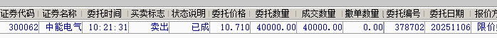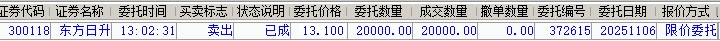 电气设备,光伏设备里面的东方日升。我是10月30号直播间提示的,星期三东方日升盘中大涨15%,星期四盘中再次上涨10%,在直播间给大家讲到东方日升周线的压力位是120周线的压力位13块3,昨天星期四东方日升的最高价就是13块3,东方日升昨天星期四大家的高抛价格是12块9,我是13块1卖的,全部清仓了,看交割单。