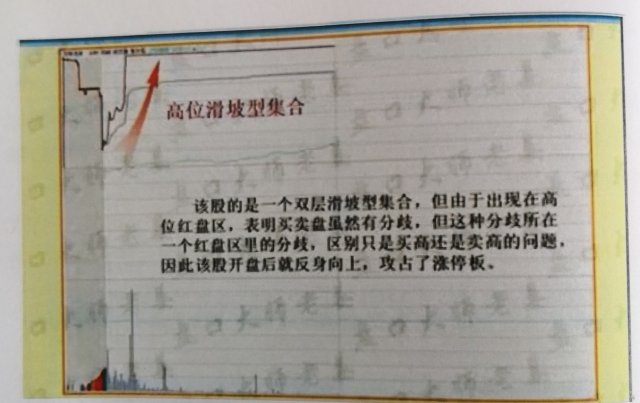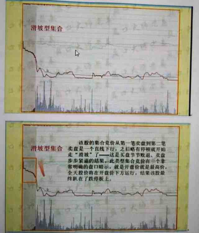 此种集合形态往往出现在一轮下跌的中后段,属于加速下跌的性质。一旦看见出现在绿盘区,应该在第一时间输跌停板价格卖出,多数情况下,此种开盘价往往就是当天的最高价。而红盘区的滑坡型则另当别论,视其具体情况而定。