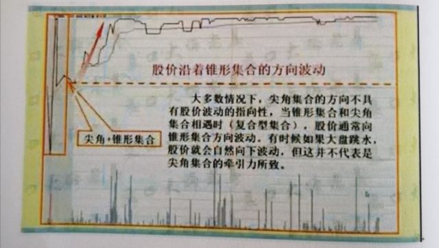 锥形集合是多空双方买卖意愿极大反差的结果,其集合最大的特点是卖出价和买入价格都是一种跳跃性出现,顺序是先有低位卖盘一一再有跳跃性的高位买盘一一然后再来跳跃性的低位卖盘。且买卖之间的时间差很短,于是就出现了类似锥子形状的集合图形。锥形集合往往具有股你当天波动极限范围的提示作用,一般在红盘区出现,锥尖越高,其指向性越强,大多数情况下,股价都能向锥尖波动。