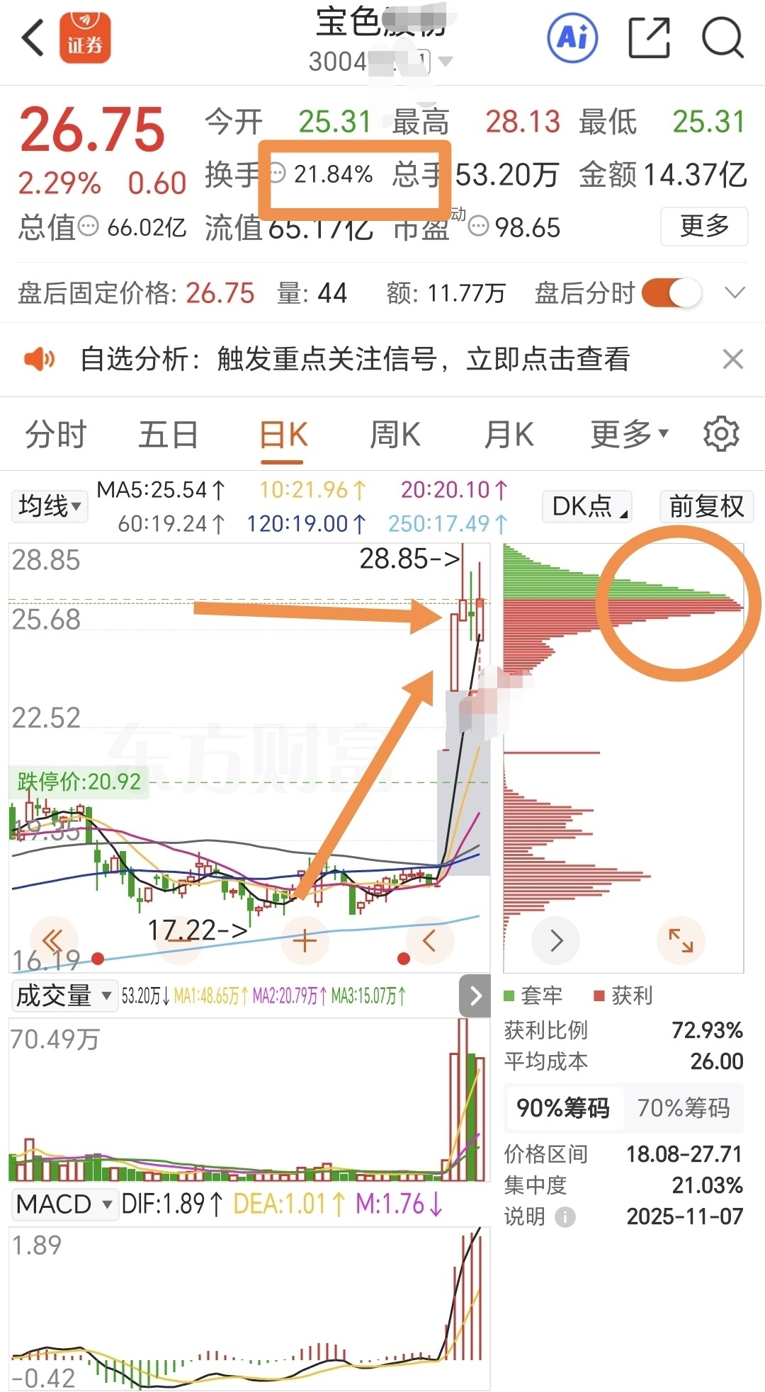 小金属+核能核电+海洋经济+海工装备,强势两涨停后,高位震荡3天,每天50%充分换手,较充分释放抛压,回踩有支撑,五日线上方运行,周五站上第二个涨停上方,获得有效支撑,筹码峰单峰密集,可以留意后续量能维持状态下趋势上行可能。