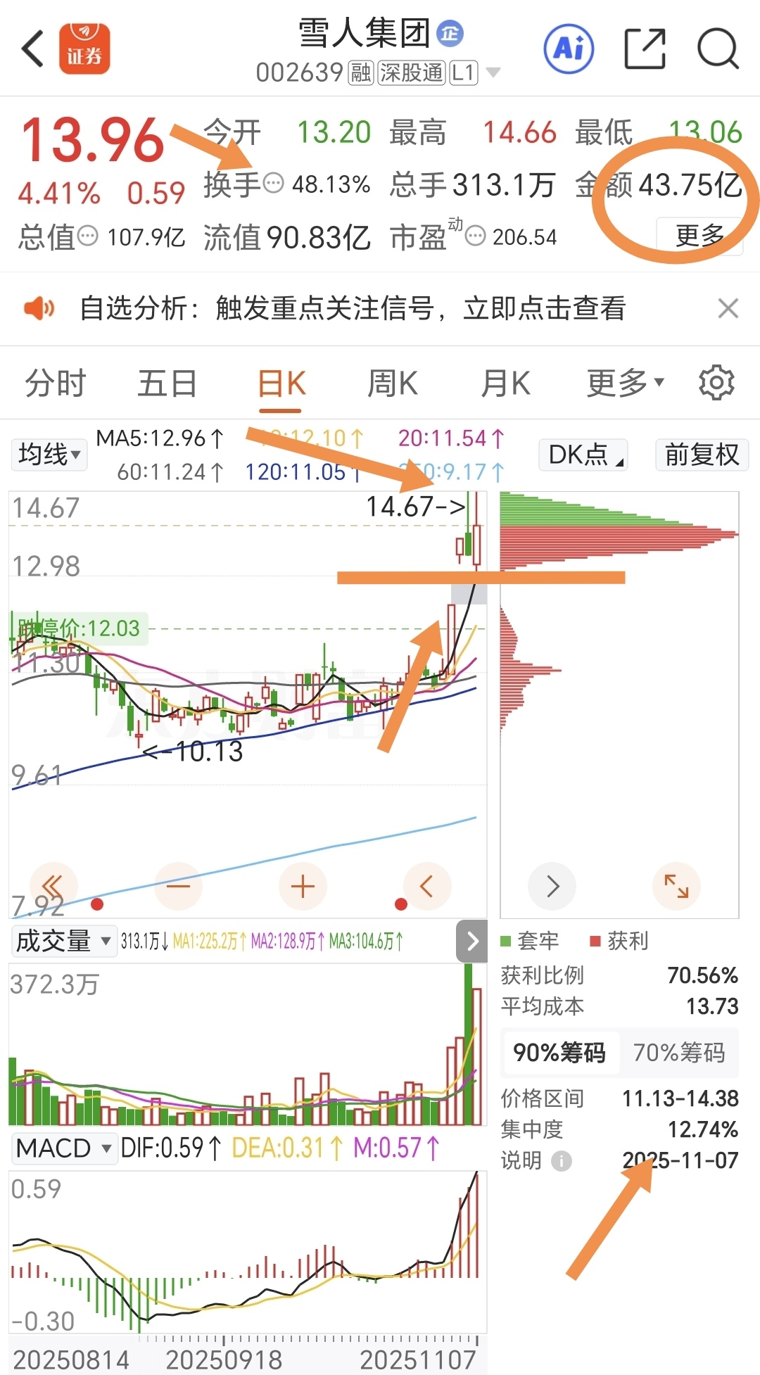 雪人股份:冰雪经济+可控核聚变+福建板块+数据中心+华为概念!强势两涨停后,断板爆量高换手,50%充换手,较充分释放抛压,周五强分歧消化获利盘,五日线上方运行,目前货支撑,筹码峰单峰密集,12.74%,后续关注5日线上方运行,可以留意量能维持状态下趋势上行可能。