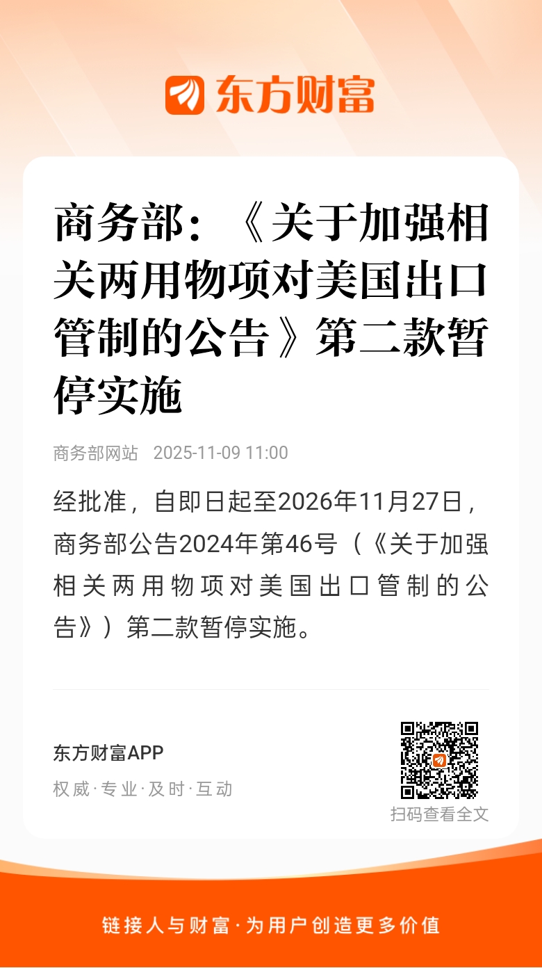 经批准,自即日起至2026年11月27日,商务部公告2024年第46号(《关于加强相关两用物项对美国出口管制的公告》)第二款暂停实施。
