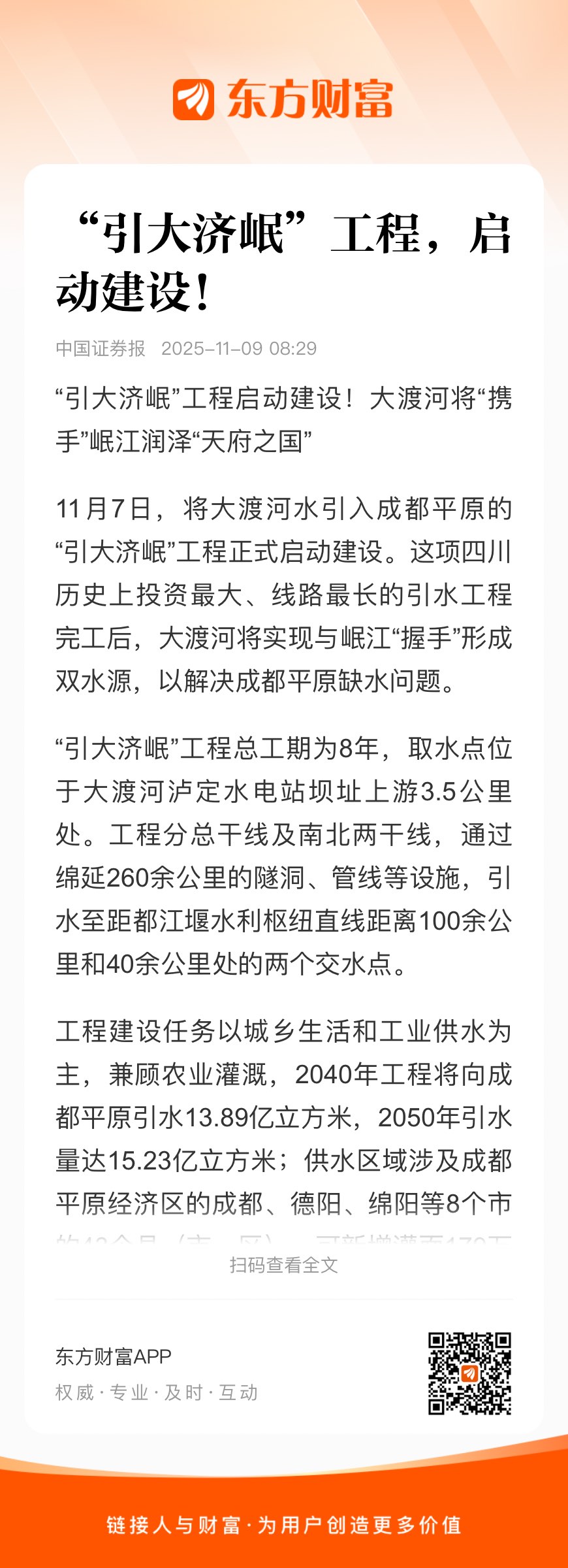 11月7日,将大渡河水引入成都平原的“引大济岷”工程正式启动建设。这项四川历史上投资最大、线路最长的引水工程完工后,大渡河将实现与岷江“握手”形成双水源,以解决成都平原缺水问题。