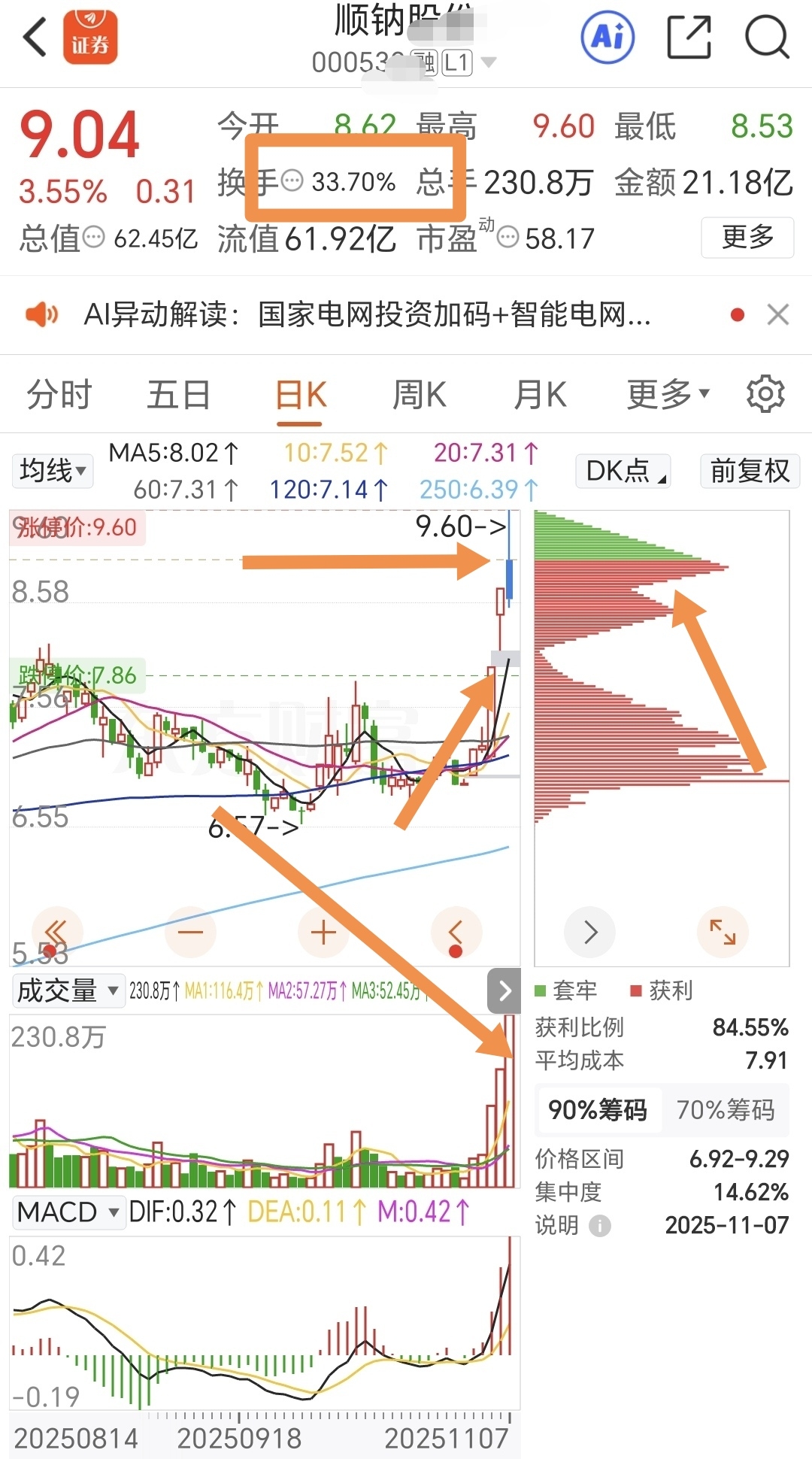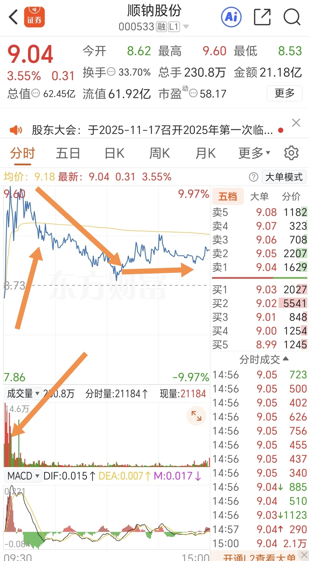 两连板后,周五早盘快速拉升,冲高涨停未封住顺势回落,高位爆量换手,实际换手55%,日线走势落差较大,但下午并未向下砸盘,维持震荡,并有向上涨的势头,收盘能维持在3.55%,实属强。下周一可以根据开盘集合竞价是否强势来判定,所能平开或者小幅高开,在分时线上方企稳可能会走出反包阳。