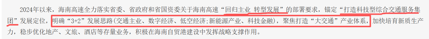 $海南高速(SZ000886)$业务布局:海南高速全力落实省委、省政府和省国资委关于海南高速“回归主业 转型发展”的部署要求,锚定“打造科技型综合交通服务集团”发展定位,明确“3+2”发展思路(交通主业、数字经济、低空经济;新能源产业、科技金融),聚焦打造“大交通”产业体系,加快培育新质生产力,稳步优化地产、文旅、酒店等存量业务,积极在海南自贸港建设中发挥战略支撑作用。学习了《国务院办公厅关于加快场景培育和开放推动新场景大规模应用的实施意见》(国办发〔2025〕37号),对应 内容摘要 跟 海南高速 关联 如下: