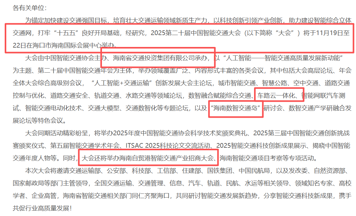 8.国有企业特别是中央企业主动开放主业领域场景,吸引民营企业、中小企业和科研院所参与,强化场景开放协同共享。支持民营企业主动发掘市场需求,探索拓展新场景。————-海南高速属于国企,承担海南高速公路车路云一体化试点建设,11月19日海南举办中国智能交通大会,大会是海南高速控股股东海南交通集团承办,大会安排海南智能交通招商大会。