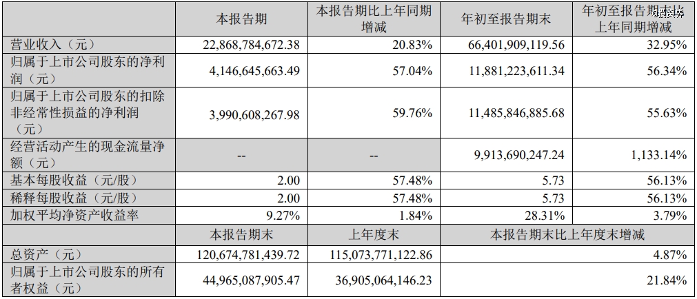 今年大涨,还是离不开业绩。根据刚刚发布的三季报,阳光电源今年前三季度营业收入664.02亿元,同比增长32.95%;归母净利润118.81亿元,同比增幅高达56.34%。其中第三季度表现尤为突出,单季实现营业收入228.69亿元,同比增长20.83%,归母净利润41.47亿元,同比大增57.04%。