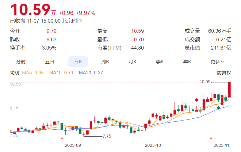 11月7日上午,海南矿业股价强势涨停,收盘股价上涨9.97%至10.59元。截至当天收盘,其封单资金高达1.09亿元,占流通市值的0.52%。