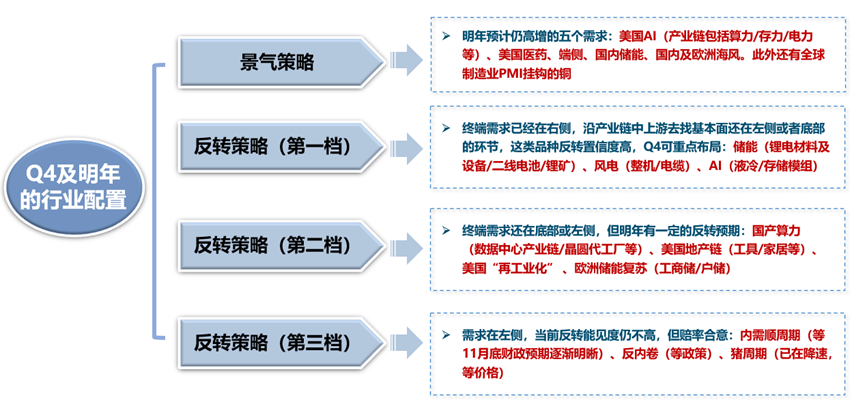 (1)第一档:终端需求已经在右侧,沿产业链中上游去找基本面还在左侧或者底部的环节,这类品种反转置信度高,第四季度可重点布局。储能(锂电材料及设备/二线电池/锂矿)、风电(整机/电缆)、AI(液冷/存储模组)。