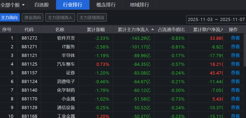 美股相关板块的下跌也传导到了A股,软件开发、IT服务、半导体等前期热门科技板块最近一周资金大幅流出: