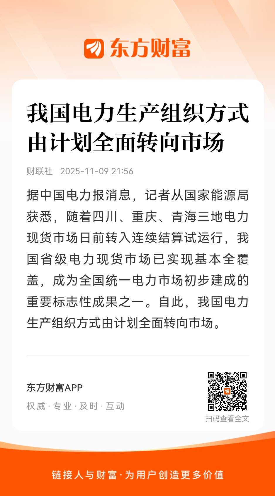 据中国电力报消息,记者从国家能源局获悉,随着四川、重庆、青海三地电力现货市场日前转入连续结算试运行,我国省级电力现货市场已实现基本全覆盖,成为全国统一电力市场初步建成的重要标志性成果之一。自此,我国电力生产组织方式由计划全面转向市场。