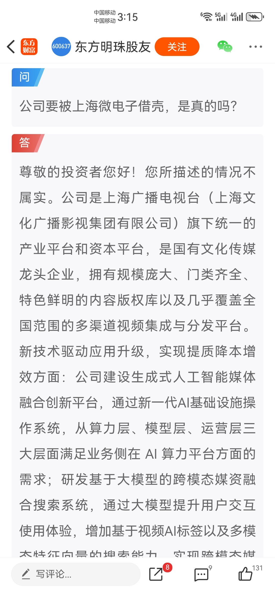 问董秘,请问上海微电子是否借壳公司?答尊敬的投资者您好!公司如有需公开披露的重大事项或业务进展,公司将及时进行信息披露。相关信息请以公司披露的公告为准,感谢您对公司的关注!来自 上证e互动答复时间 2025-10-27 09公司要被上海微电子借壳,是真的吗?答尊敬的投资者您好!您所描述的情况不属实。公司是上海广播电视台(上海文化广播影视集团有限公司)旗下统一的产业平台和资本平台,是国有文化传媒龙头企业,拥有规模庞大、门类齐全、特色鲜明的内容版权库以及几乎覆盖全国范围的多渠道视频集成与分发平台。新技术驱动应用升级,实现提质降本增效方面:公司建设生成式人工智能媒体融合创新平台,通过新一代AI基础设施操作系统,从算力层、模型层、运营层三大层面满足业务侧在 AI 算力平台方面的需求;研发基于大模型的跨模态媒资融合搜索系统,通过大模型提升用户交互使用体验,增加基于视频AI标签以及多模态特征向量的搜索能力,实现跨模态媒资融合搜索,优化视频搜索结果;通过不断优化数据资产管理、提升数据汇聚和互通效率、推动数据驱动的业务创新。具体内容详见公司年报第三节“管理层讨论与分析”。感谢您对公司的关注。来自 上证e互动答复时间 2025-08-26 08:43: