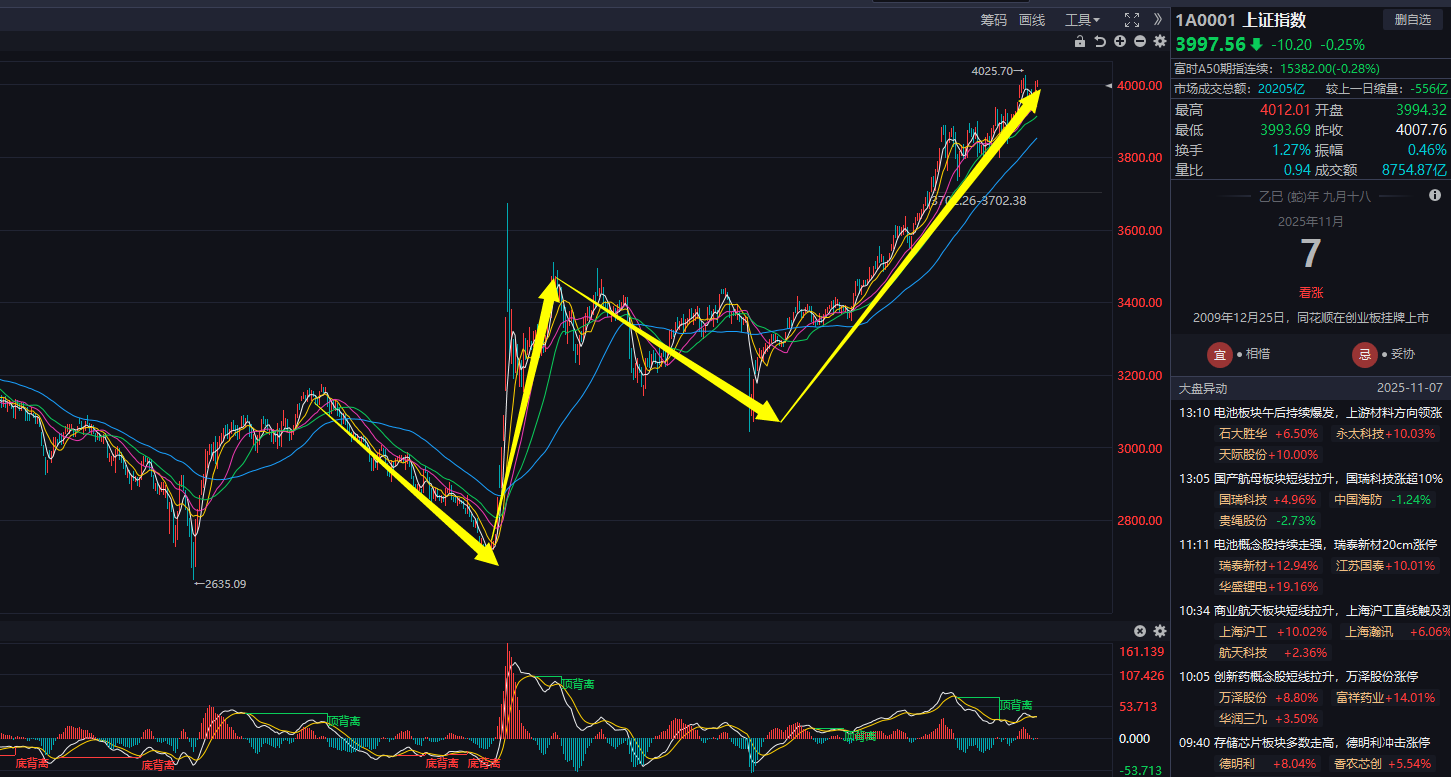 周五行情还无意外的再次上了4000点就“扣费”每次到了这个位置就跳水,4000点的阻力位比较强,不磨一段时间是不会上去的,年底之前行情会站稳4000点的,短期还需要时间震荡。
