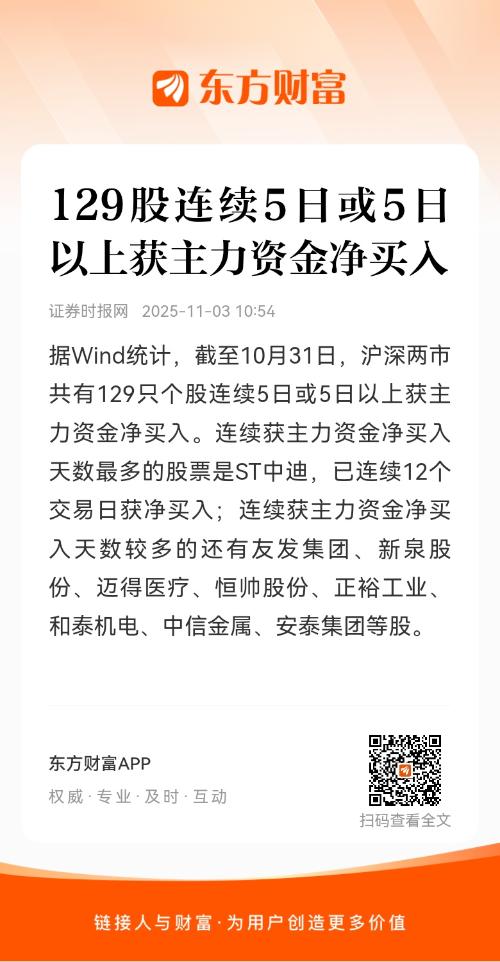 据Wind统计,截至10月31日,沪深两市共有129只个股连续5日或5日以上获主力资金净买入。连续获主力资金净买入天数最多的股票是ST中迪,已连续12个交易日获净买入;连续获主力资金净买入天数较多的还有友发集团、新泉股份、迈得医疗、恒帅股份、正裕工业、和泰机电、中信金属、安泰集团等股。