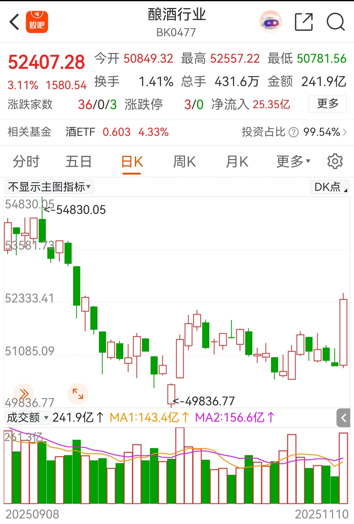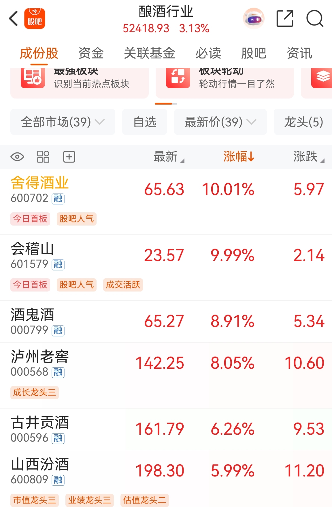 酿酒板块如约大涨,舍得领衔封板,会稽山,酒鬼,泸州,古井等紧跟其后,相继封板或接