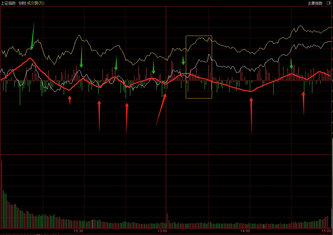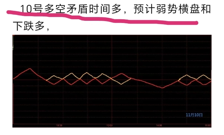 今天图只有下午画黄框的一小段是倒序,导致高低幅度不准,不然又能一模一样了。弱势横盘的矛盾走势也符合。