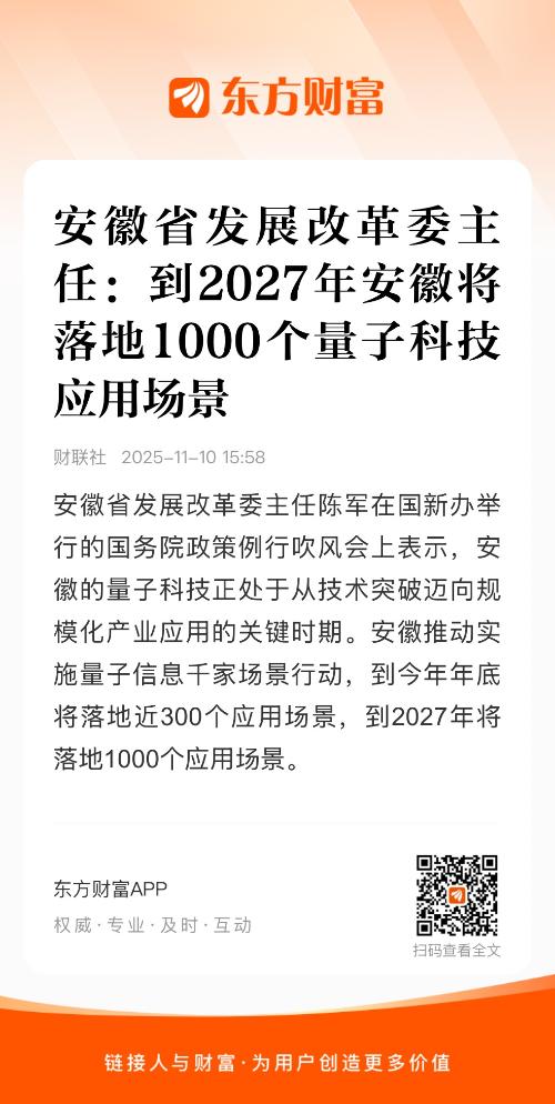 安徽省发展改革委主任陈军在国新办举行的国务院政策例行吹风会上表示,安徽的量子科技正处于从技术突破迈向规模化产业应用的关键时期。安徽推动实施量子信息千家场景行动,到今年年底将落地近300个应用场景,到2027年将落地1000个应用场景。