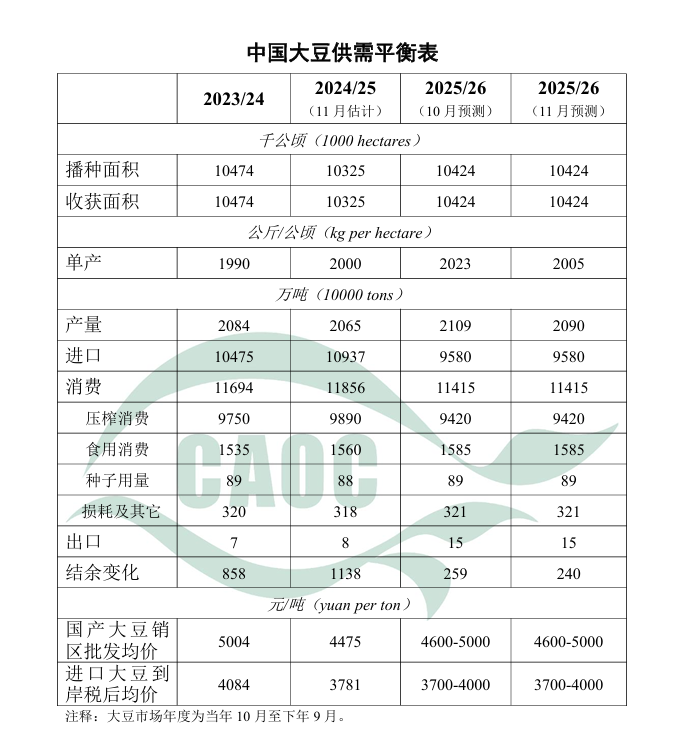 据海关统计,2024/25年度中国大豆进口总量10937万吨,出口总量8万吨。2025/26年度大豆秋收已近尾声,其中,东北产区气象条件良好,单产普遍提升,黄淮海及南方产区受不利天气影响,单产稳中略降,本月将大豆产量预测值微调至2090万吨。新季大豆市场运行总体平稳,优质优价特征凸显,高蛋白大豆供给偏紧,价格稳中有升。高油大豆走势后期存在一定不确定性,建议农民把握好市场行情,适时售豆。全球大豆供应宽松,美国大豆已收获八成以上,进度快于去年同期,产量预计稳定在1.1亿吨以上;南美气候条件总体有利,新季大豆播种顺利。(农业农村部)