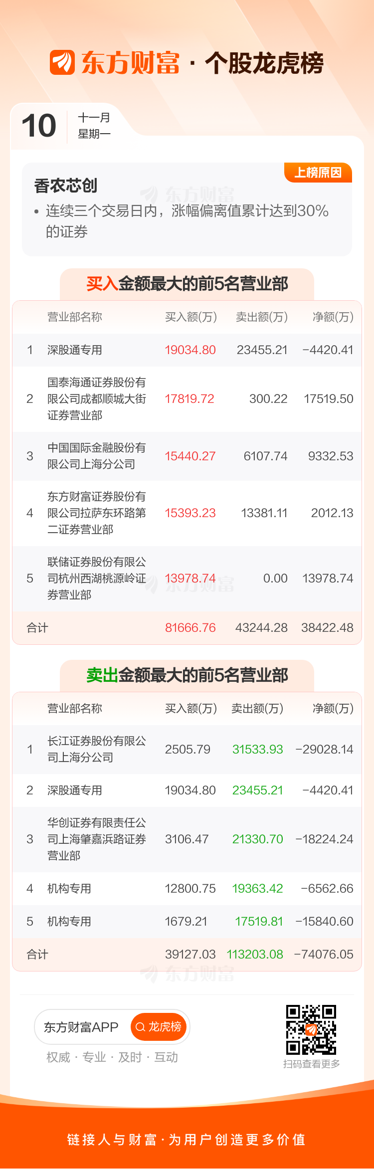 交易所2025年11月10日公布的交易公开信息显示,香农芯创因成为连续三个交易日内,涨幅偏离值累计达到30%的证券上榜。香农芯创当日收报195.82元,涨跌幅15.19%,换手率11.36%,成交额89.62亿。异常期间11月6日至11月10日,期间涨幅32.04%,累计偏离值31.51%,区间成交额211.75亿。