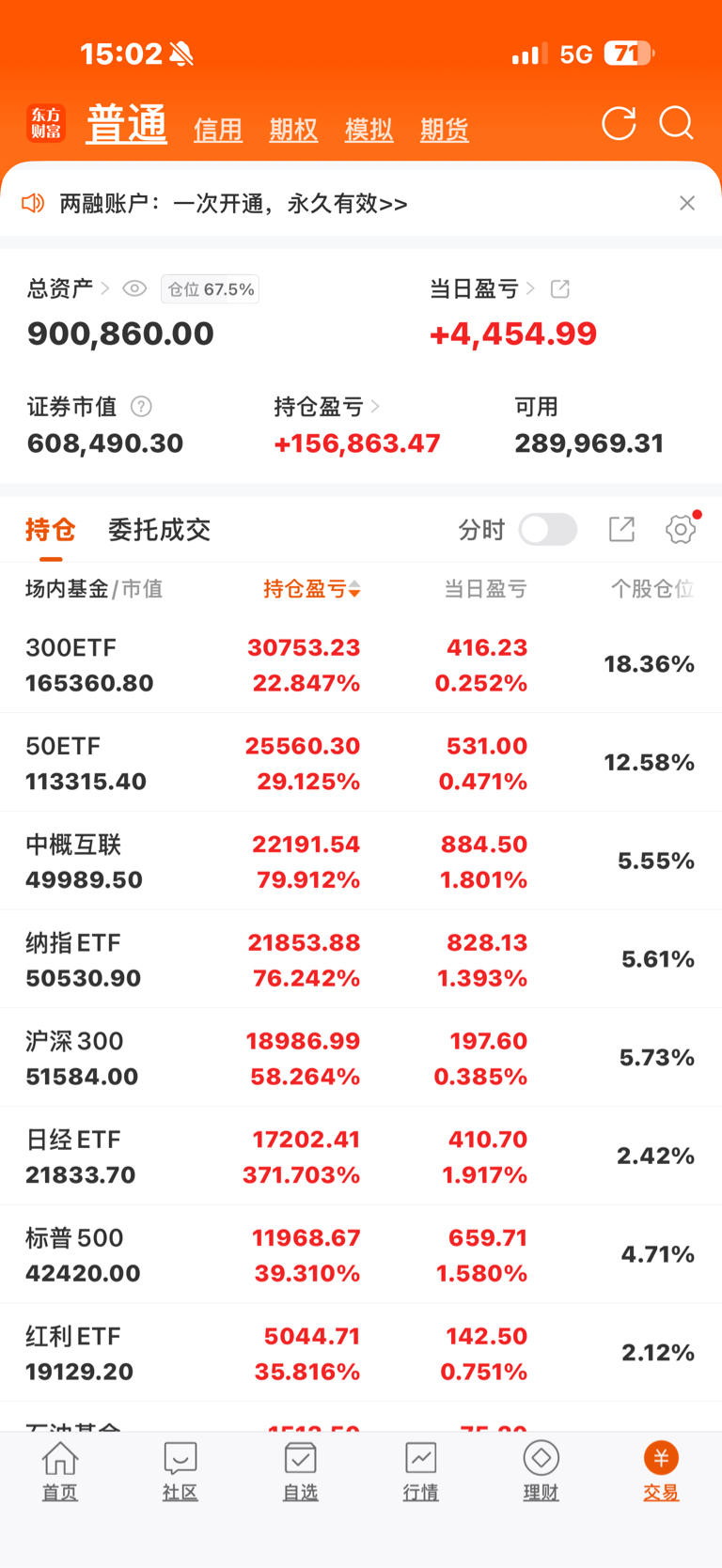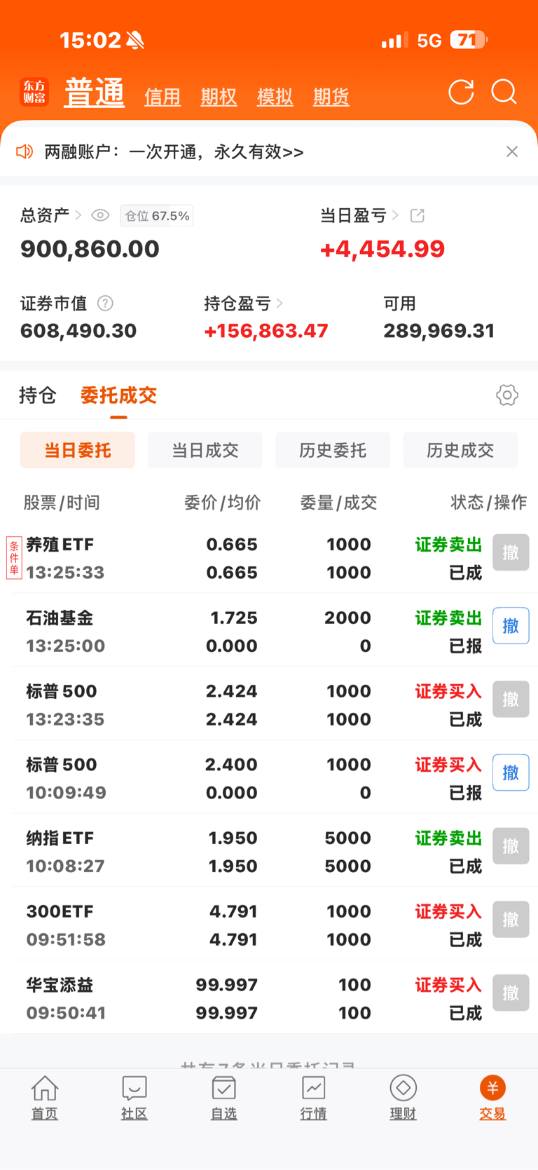 今日盈利4454元。定投买入,标普500,纳指,沪深300触发一个养殖条件单,目前养殖ETF只是测试,不作为主力投入。