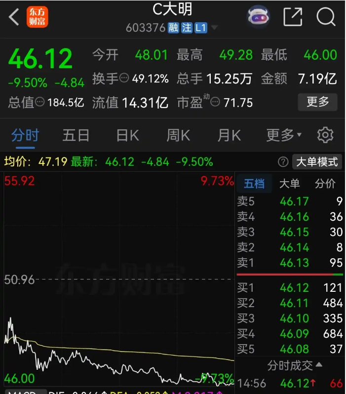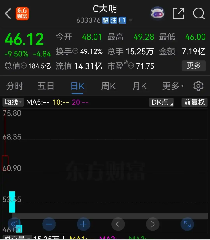 上市第二天,大明电子低开低走,收盘股价报收于50.96元,大跌20.93%。今天是大明电子上市第三天,再次跳空低开低走,盘中最低跌到了46元,跌幅一度近10%,收盘股价报收于46.12元,仍然大跌9.50%。